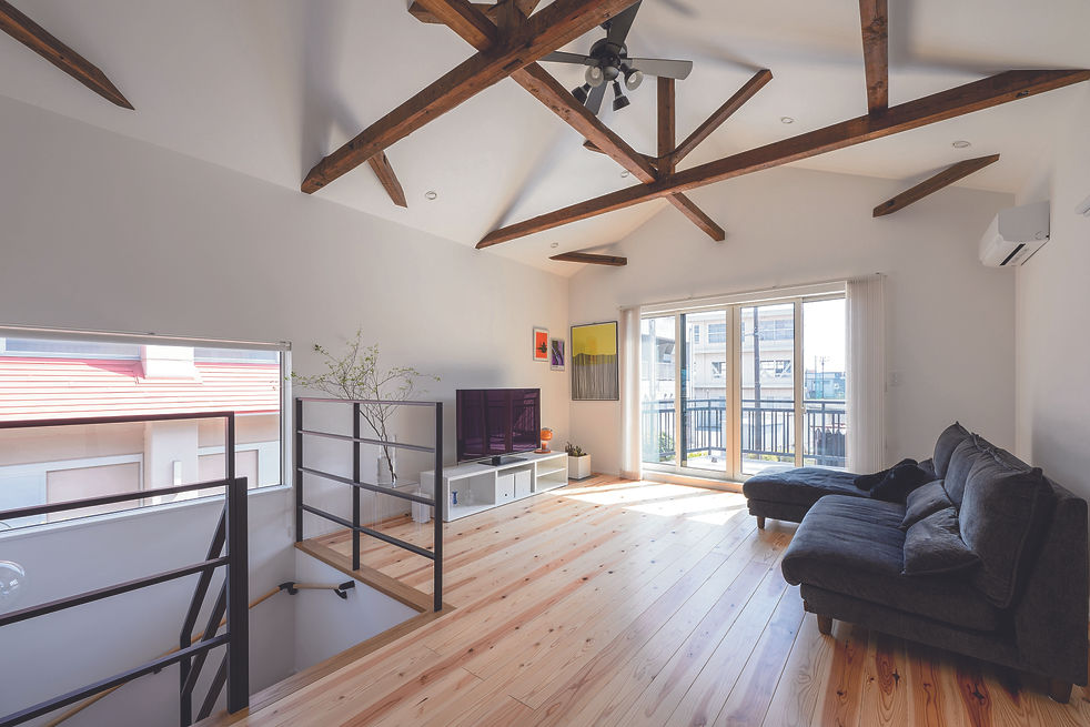 キッチン部分は板張り天井にすることで高低差のある天井になり空間がより広く見えます。